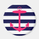 A bright, neon pink silhouette of an anchor is on a navy blue and white striped background. A fun, nautical design.