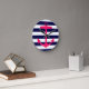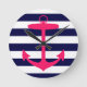 A bright, neon pink silhouette of an anchor is on a navy blue and white striped background. A fun, nautical design.