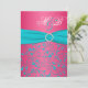 This FAUX embossed look watermelon pink and bright aqua blue damask invitation is shown here as a monogrammed wedding invitation but you can customise it to work for several different events. The paper choice is customisable. *** PLEASE NOTE the ribbon and jewels are PRINTED images, and are not real. If you require any other matching items, or would like this in a different colour combination, please email your request to niteowlstudio@gmail.com