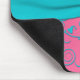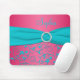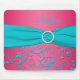 This elegant looking pink and aqua blue damask mousepad has a matching faux ribbon and crystal brooch. Customise it with your own name, monogram, or other text.