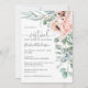 A beautifully feminine virtual baby shower invitation design featuring a corner bouquet of watercolor poppies, roses, eucalyptus and trailing greenery in pastel beige, pink, green and blue-green. Trendy type face pairings include handwritten script and elegant serif. This invitation is designed especially for online baby showers that are conducted using skype, zoom, facebook live or another means of connecting online. It makes a great choice when honouring mother's to be who live far away or for times when it is not possible to gather together in face-to-face. Personalise the easy to use text template with your event details.