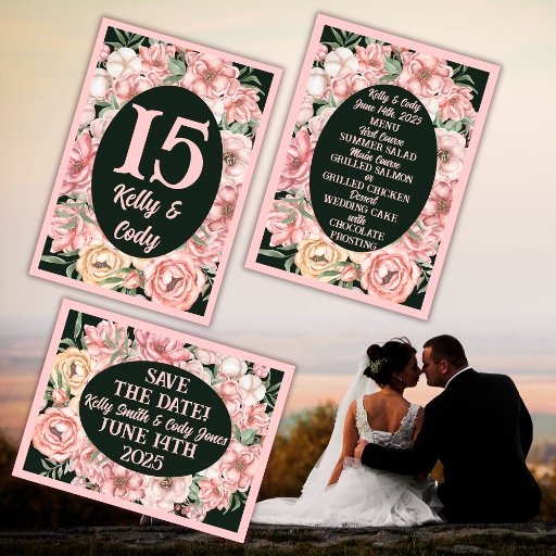Pink and Beige Flower Oval on Deep Green Wedding Invitation