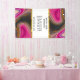 A birthday banner with a groovy looking abstract design. Pink and black colours mix and mingle together in a swirling motion. Sprinkles of faux gold glitter in between the layers. A white rectangle frame with a faux gold foil border, layered over top with your personalised text inside.