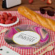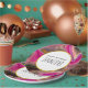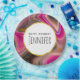 Happy Birthday paper plates with a groovy looking abstract design. Pink and black colours mix and mingle together in a swirling motion. Sprinkles of faux gold glitter in between the layers. A white circle frame with a faux gold foil border layered over top with your personalised text inside.