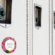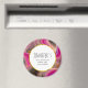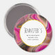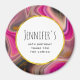 Birthday / event thank you magnet with a groovy looking abstract design. Pink and black colours mix and mingle together in a swirling motion. Sprinkles of faux gold glitter in between the layers. A white circle frame with a faux gold foil border, layered over top with your personalised text inside.