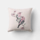 A pillow with a watercolor painting. 2 pink and black birds sitting on a tree branch with pink blossoms.