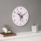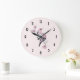 A clock with a watercolor painting. 2 pink and black birds sitting on a tree branch with pink blossoms.