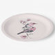 Paper plates with a watercolor painting. 2 pink and black birds sitting on a tree branch with pink blossoms.