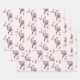 Wrapping paper with a watercolor painting. 2 pink and black birds sitting on a tree branch with pink blossoms.