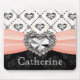 Personalise this pretty pink and black damask mouse pad with a satin ribbon and rhinestone heart design with your name. A diamond heart and solitaire design with a subtle striping make up the top of the design. Artwork and design © Chrissy H. Studios, LLC. All rights reserved.