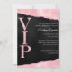 This custom party or event invitation features a glamourous pink and black VIP theme. The background has a black foil gradient pattern in the centre, with shiny looking pink foil abstract tears across the top and bottom portion. The VIP title is printed vertically on the left, in a large pink glitter font.