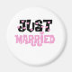 Pink and black text with pink hearts design Just Married T-shirts, tote bags, mugs, stickers, buttons, cards, magnets, and more, perfect for the new bride!