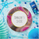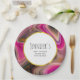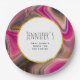 Baby shower paper plates with a groovy looking abstract design. Pink and black colours mix and mingle together in a swirling motion. Sprinkles of faux gold glitter in between the layers. A white circle frame with a faux gold foil border, layered over top with your personalised text inside.