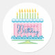 A pink and blue birthday cake with green candles and pedestal to put the finishing touches on all your birthday wishes.