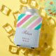 Pink and Blue bride to be can cooler is a one of a kind koozie for your bridal shower party.  The front top half features pink blue and green diagonal stripes and the bottom half displays blue background.  The bride's information is in customisable pink font.
