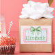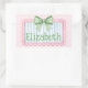 This cute rectangle sticker features a pink frame with blue and white stripes and topped with a preppy green and white gingham plaid bow on a background of pink and white polka dots. Personalize with your choice of name or special text.