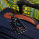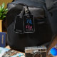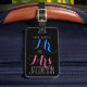 Here's an ultra chic luggage tag created especially for married couples. A black background accented on the front with bold, block lettering in white, pink and blue. Easily personalised with your last name. Customise and resize the last name if needed to fit/fill the area. The reverse side has additional text area that you can easily personalise with your contact information just in case your bag gets lost.