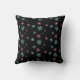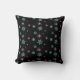 A pillow with a cold and wintery christmas pattern. A repeating pattern of pink and blue snowflakes set on a black background. A seasonal holiday design.