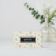 A cold wintery pattern covering this business card template. A repeating pattern of pink and blue snowflakes set on a cream coloured background. A simple classy black rectangle in the centre, with a white border to enter your business details inside.