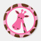 Adorable pink and brown spotted giraffe is perfect for the giraffe lover and is the perfect design for giraffe themed " It's a Girl" baby showers! Design features a pink background with brown giraffe spots. In the centre is a white circle with pink trim and a pink and brown giraffe's head. This cute design is the perfect baby shower favour and is available on a baby shower invitation as well!