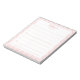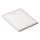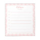 The borders of this notepad have a light pink background colour together with a white decorative damask pattern. The middle background is white and it has a checklist on it with eight checkboxes. On the top there are personalizable text areas for the title of the notepad and for a name.