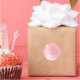 A chic bridal shower favour sticker featuring a bride wearing an elegant lace wedding gown on a blush pink background with beautiful gold script text for your special bridal shower details. You can customise the background colour to coordinate with your wedding theme.
