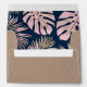 Pink and gold tropical leaves rustic wedding envelope. This pretty design features a pattern of Split Leaf Philodendron (Monstera deliciosa) or Swiss Cheese Plant and palm leaves in blush pink with gold outline on navy blue background the inside. The outside includes a rustic kraft paper style.