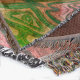 A soft throw blanket in shades of pink and green, including lime and chartreuse, in undulating waves inspired by layered stone patterns. A bright and colourful Boho chic blanket to wrap up in.