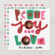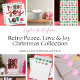 Retro-inspired "Peace, Joy, and Love" message in pink, red, and green