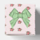 Cottage chic wedding favour box done in a lovely pink and white stripe pattern with pink roses, with graphics of a green satin looking bow, on the top, and ribbon, around the middle of the box. A green and white oval text plaque, on the front, has black custom text ready to personalise. Lovely little gift box for candies and anything else you want to give your guests.