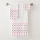 A stylish pink and grey diamond-patterned bathroom towel set.