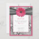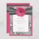 The text on this honeysuckle pink and charcoal grey floral damask pink gerbera daisy wedding reply card is fully customisable. To change it use the personalise option. For more extensive text changes, such as changes to the font, font colour, or text layout, use the customise option. You could also use this card as a reception, direction, or accommodation card with changes to the text.