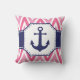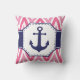 Pink and blue nautical decorative pillow. The pillow is decorated with a pink chevron print and features a navy blue anchor. Colorful and bright this pillow adds interest and joy to your living space.