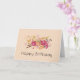 A birthday card with a pretty digital image made from watercolors. Pink and orange flowers in a bouquet with twigs, sprigs and leaves in brown and orange colours. The background is a pretty orange peach colour. Message on the inside which you can personalise or leave as is.