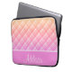 This laptop sleeve features a gradient pastel orange and pink plaid pattern with a thick pastel pink stripe and thin white stripe and a customisable name.