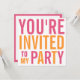 This is a fun birthday party invitation for girls of all ages! Eye catching bright pink and orange coloured bold text. The reverse side has a few customizeable text fields for the party details and address rsvp information in matching colours. Shown as a sleep over or slumber party. Perfect for preteens, tweens and teens.