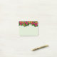The top border is surrounded by pink and orange wildflowers nestled in a bed of green leaves. The background is a pale green colour.