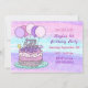 Purple and pink whimsical hand drawn birthday cake and balloons girl's birthday party invitations.