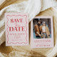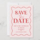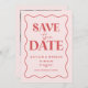 Simple retro pink red wave save the date postcard featuring a scalloped red frame on a pink background and a vintage retro calligraphy heading. The couples photograph appears on the back along with a message and details.