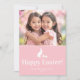 Destei's pastel pink Easter card template featuring a bunny silhouette and two Easter eggs in white color. The top half is a photo template for a custom family photo and the bottom displays a “Happy Easter!” message with space for a family name and year. Perfect for creating a cute, personalized Easter greeting. The other side of the card is blush pink.