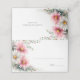 A pink and white daisies wedding table place card that includes the bride and groom's names along with their wedding date.