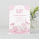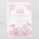 This tea party invitation has a monochromatic design featuring a pink and white tea set surrounded by birds and flowers. The top has ornate corner decorations. You can edit the text to meet the needs of your event.