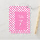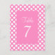 White polka dot pattern on pink with room for a table number. You can customise and erase the word "Table" and centre the number.