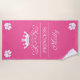 This beach towel features a white crown silhouette with dog paw silhouettes in each corner and text that reads "princess" together with a personalizable text area for a name. The background colour is pink.