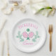 This pickleball plate design has a pink and green line art image of pickleball paddles and a martini glass surrounded by laurel branches with the phrase "Pickleball Queen." Colours used include green and pink.