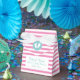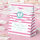 Pink and white stripes baby shower party favour box. Custom thank you for coming message. Cute lines print with elegant script typography and adorable baby footprints Customisable background colour. Baby feet design for babyshower party celebration. Girly Turquoise blue and pink colours for new baby girl / newborn child. Tent shape favour boxes. Trendy babyshower ideas.