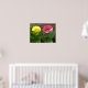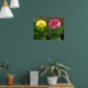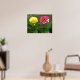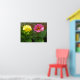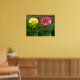 This beautiful print features a detailed photograph of a yellow and a pink Zinnia side by side against a brick wall.
