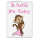 An adorable little brown monkey with a pink blanket and pink text that reads "I'm Auntie's Little Monkey!" is featured on our auntie's girl T-shirts, stickers, cards, and more!
