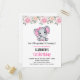 Birthday invitation with a cute pink elephant watercolor illustration. She has cute pink and white polka dot ears and a pretty pink ribbon bow on top of her head. The top is decorated with a beautiful rose bouquet.