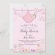 An adorable whimsical pink baby shower invitation featuring a baby bundle and baby clothes and toy on a clothesline, with a modern elegant script typeface font. Personalise with your own text information. If you prefer a different script type, you may select from our many script typeface choices by clicking "customise further", using our design tool for your selection.